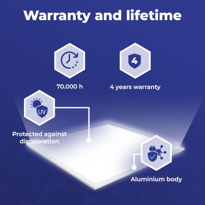 Questo pannello LED ha un ciclo di vita di 70000 ore, che vuol dire che funzionerà in modo ottimale per diversi anni. Questo ti permetterà di risparmiare sui costi di manutenzione e sostituzione! Inoltre, questo pannello LED è protetto da una garanzia di 4 anni. Infine, l'illuminazione LED permette di ridurre le emissioni di CO2 e, non contenendo sostanze tossiche, i LED possono essere riciclati.