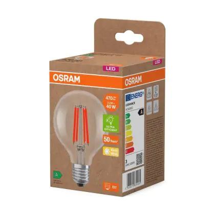 La Osram LED Lamps E27 Globe Filamento Chiara 2.2W 470lm - 827 Bianco Molto Caldo | Sostitutiva 40W è la perfetta sostituzione per la tua lampada convenzionale 40W con attacco E27 grazie alla sua tecnologia LED. Passare a LED ti offrirà tanti vantaggi!